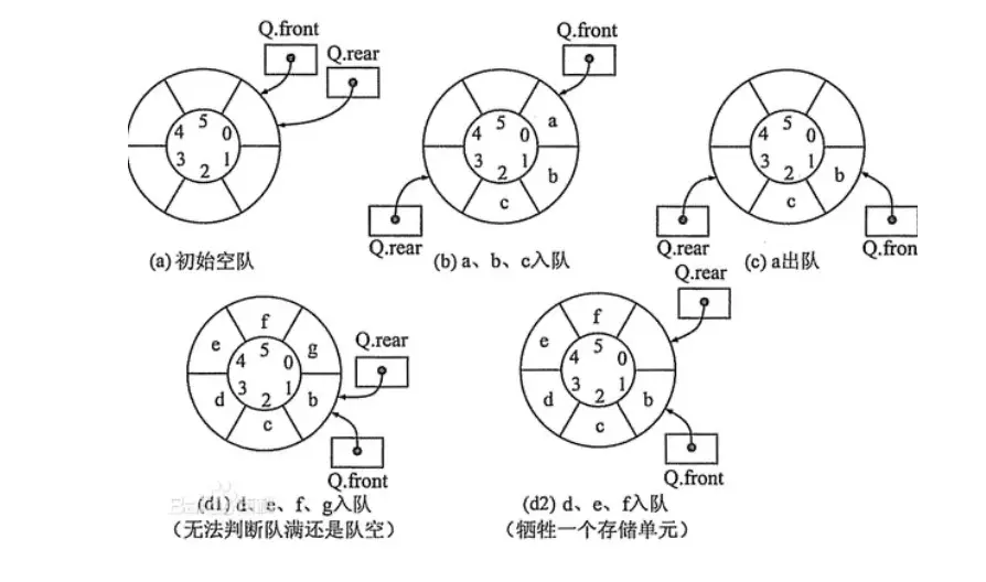 因为空队列图(c)的时候 q.front == q.rear; 队空间被沾满时图(b),也是 q.front == q.rear 。所以这样就无法分辨出是空队列还是满队列了,为了解决这个问题就在队列尾空出一个位置留白不用,如图(d)。