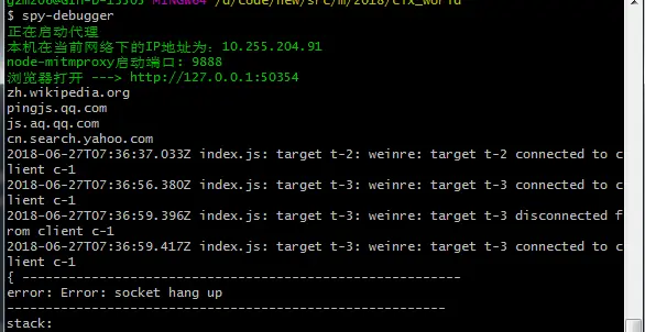 安装成功后,把需要调试的手机和电脑连到同一网络环境下,在命令行执行spy-debugger,此时会显示: 正在启动代理 本机在当前网络下的IP地址为:xxx.xxx.xx.xx node-mitmproxy启动端口: 9888 浏览器打开 ---> http://127.0.0.1:50094