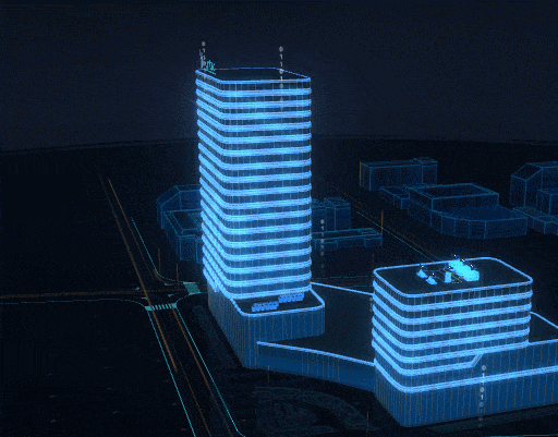 在点击智慧楼宇管理系统的按钮后,场景视角会根据 moveCamera 转移到大楼正视的视角后,大楼整体呈现渐变虚化后透明展示大楼内部信息,这个动画是封装了一个 tweenColor 颜色变化的过渡效果,从一种颜色 rgba 状态上改变色值和透明度来体现视觉上的变化。在效果展示上有一种可视化浸入式查看大楼内部信息的体验,具体的 3D 模型属性的变化可参考 <HT 的 3D 手册>。