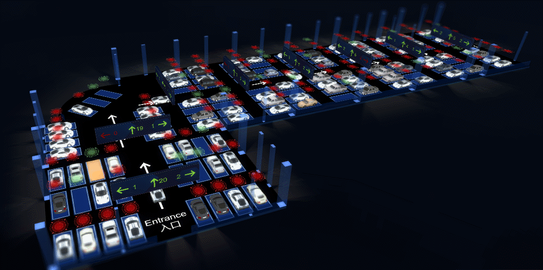 停车场作为现在楼宇监控不可缺失的一环,这里主要可以体现出实时的车位监控,通过简单的动画演示来表现出整个停车场车辆的运行状态,方便管理。