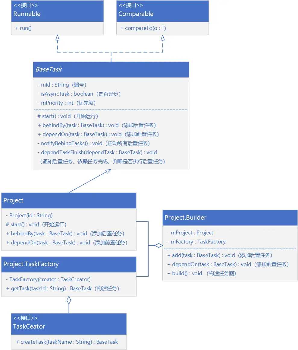 BaseTask是一个任务单元,其中定义了前置任务dependTasks与后置任务behindTasks,每个Task会有优先级,锚点任务优先级是最高的,优先级主要用来排序。- 当向taskB中加入一个前置条件taskA时,taskA会被加入taskB的前置任务