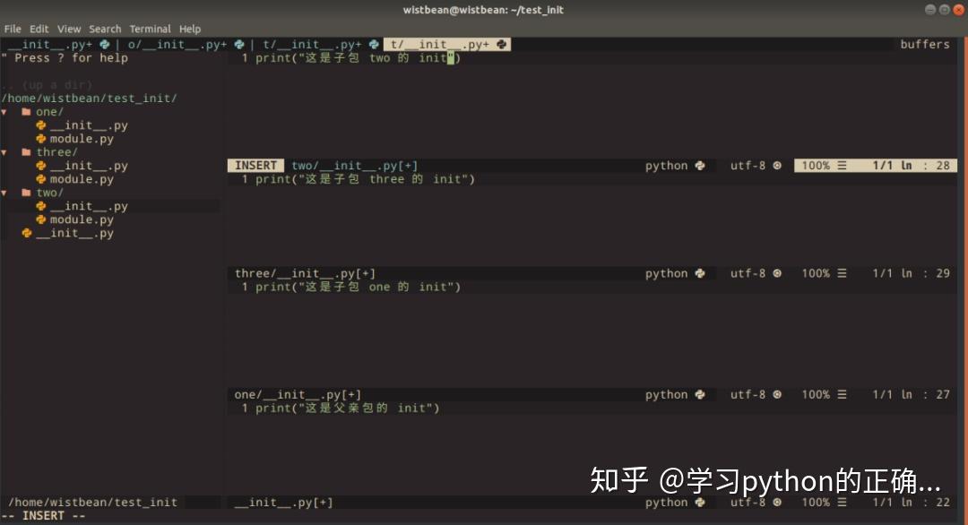 我们在这里面创建了三个 Python 子包,里面都有 __init__ 和 module 的 py 文件。