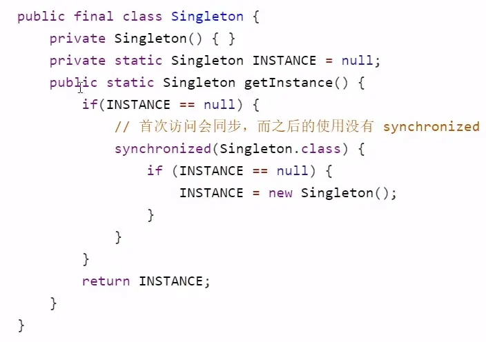 - 首次使用getInstance()才使用synchronized加锁,后续使用时无需加锁