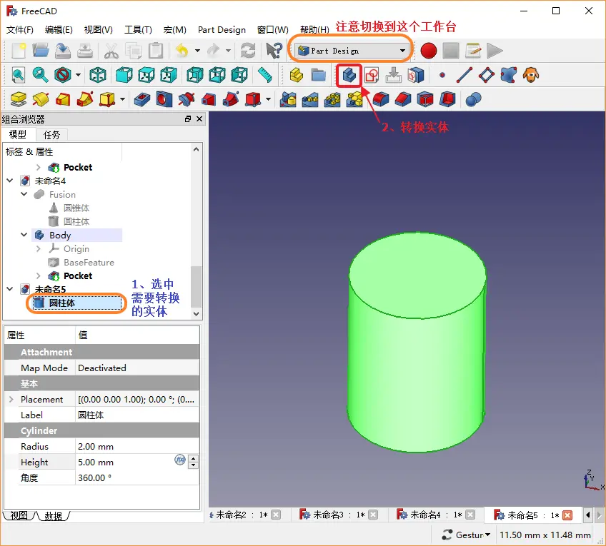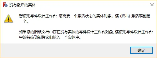 想使用零件设计工作台,您需要一个激活状态的实体对象。请(双击)激活或创建一个。如果您的旧版文档中存在没有实体的零件设计工作台对象,请使用零件设计工作台中的转换功能将它们放入一个实体中。