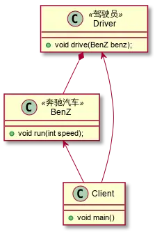 创建汽车驾驶员 Driver类型,他可以驾驶BenZ类型的汽车,我们初步的设计可能是下面的UML设计图,