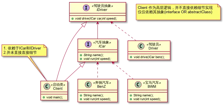 根据依赖注入的要求我们可以知道,各个类之间不能依赖于细节,而应该依赖于其抽象,基于此,我们将汽车驾驶员和汽车进行抽象,上层仅仅依赖于抽象,而非细节,实现UML如下: