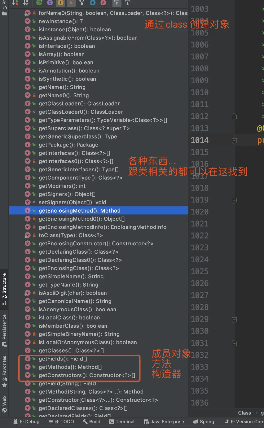 既然说,Class对象代表着类相关的信息,那说明只要类有什么东西,在Class对象我都能找得到。我们打开IDE看看里边的方法: