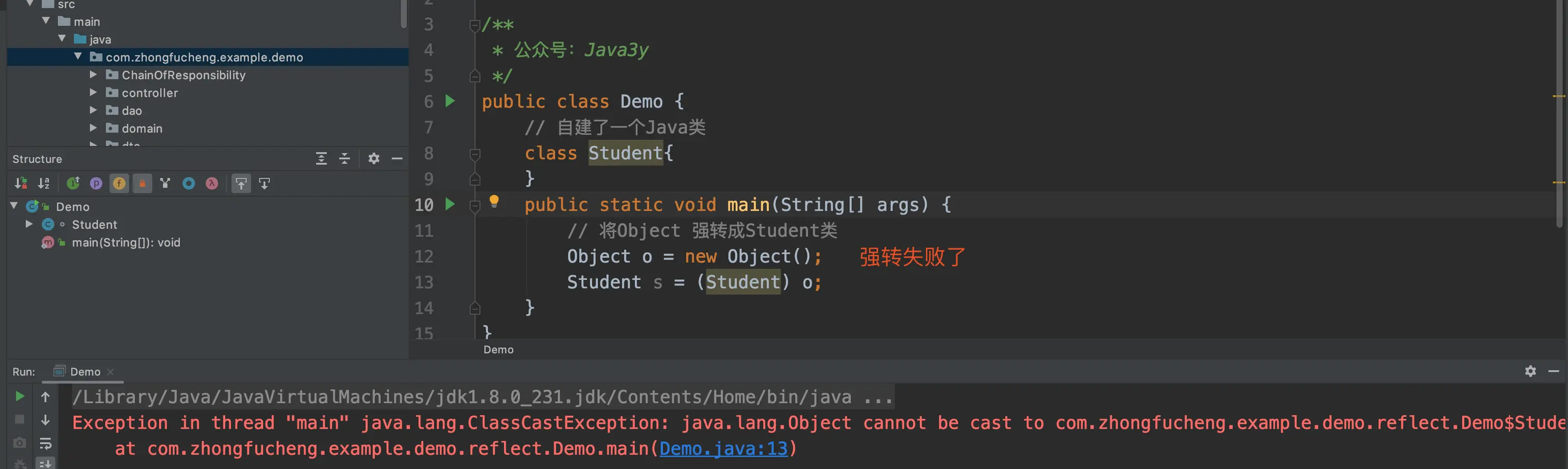 Object(); Student s = (Student) o; }}我们在IDE编写这一段代码的时候,不会出现任何的错误。但是等我们执行的时候,我们会知道这肯定强转失败了。