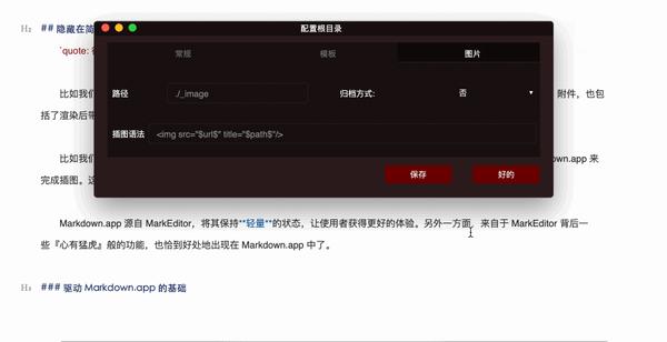 Markdown.app 管理的是本地的文件夹,这非常方便数据的备份与迁移,我们没有创造出新的数据格式,却也能支持基本的全文检索。而且基于当前的工作目录,还能有更多的定制,比如文档列表的排序、摘要显示几行、新建文档的文本模板、自定义的 CSS 样式,甚至图片的语法也可以自行定义。