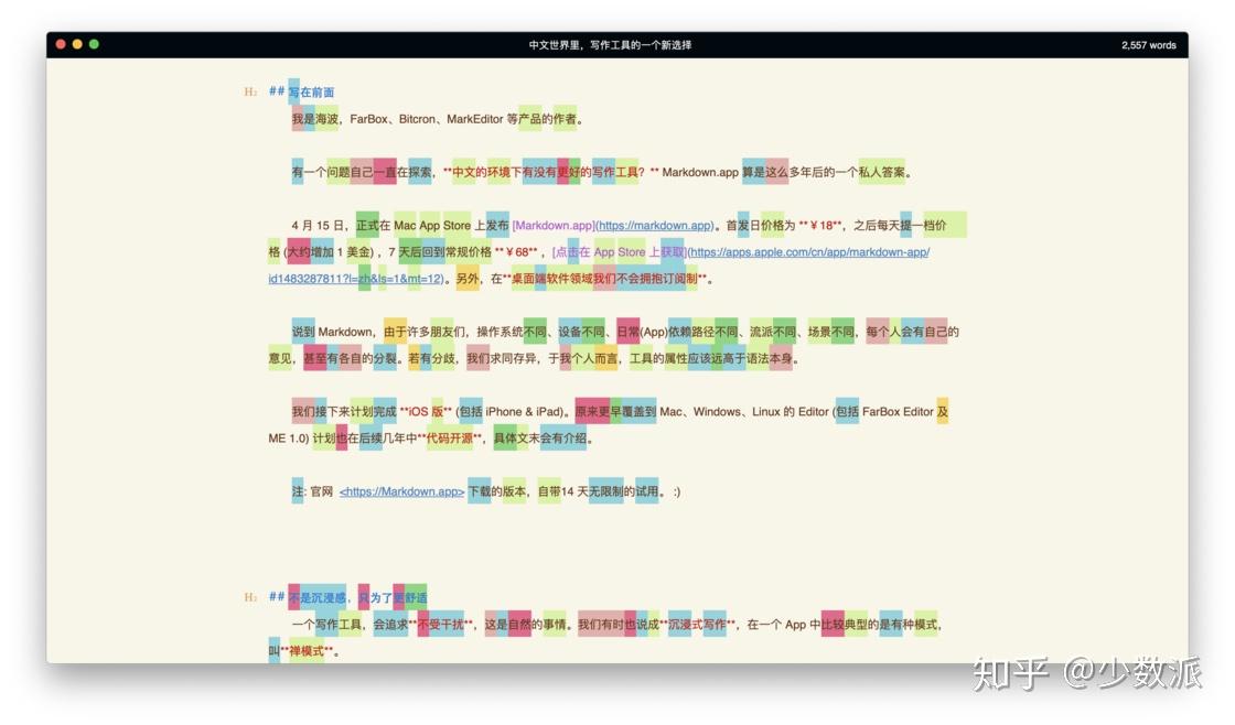 Markdown.app 虽然是新产品,但源码追溯起来还有不少部分来自于 8 年前的 FarBox Editor,所以一点一滴地改善,都累积起来,自然就「对中文更友好」了。