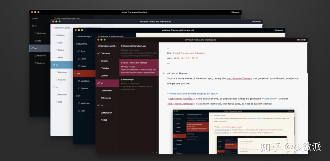 Markdown.app 可以给每个文件夹设 ICON,而真正强大的自定义能力体现在视觉模板上,有将近 400 个设置项。由于设置项实在太多,我们还有一个算法随机生成视觉主题,目前 App 默认提供的 8 个视觉主题中,其中一个来自于老朋友 CaiCai,另外还有 4 个是随机生成后保留下来的。