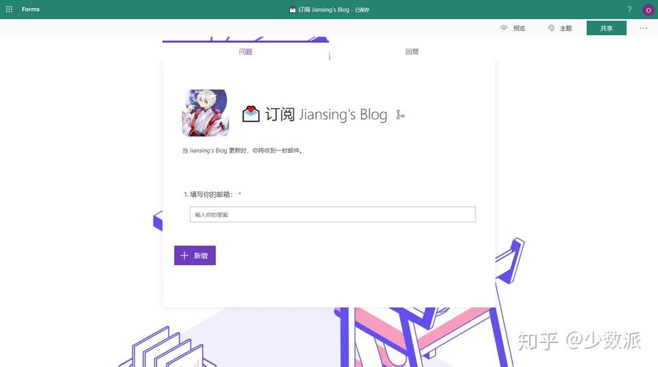 创建完成后会自动跳转到 Microsoft Forms 进行编辑,我们在表单里设置一个问题来收集订阅者的邮箱。