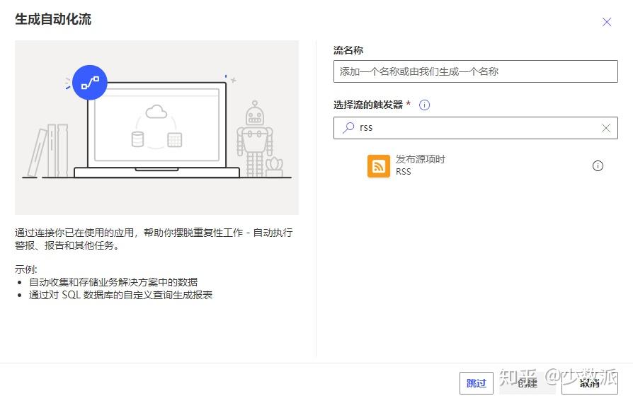 2. 搜索「RSS」可以找到这个触发器,选择它并点击「创建」。