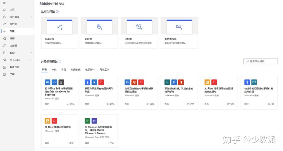 1. 进入 Power Automate,点击「创建」,创建一个「自动化流」,此外,它还提供了「即时流」、「计划流」以及「业务流程流」。
