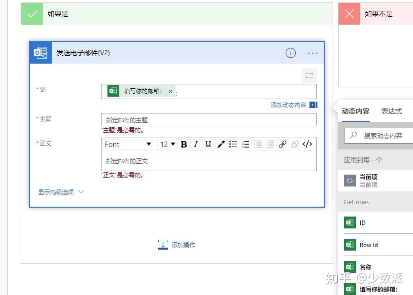 「到」里面「添加动态内容」,选取「Get rows」的「填写你的邮箱:」并加上;。注意这是我的表单上设置的问题,请选取你自己设置的问题提示文本。不要选择「电子邮件」,因为当 Microsoft Forms 设置为「具有链接的所有人均可回复」时,「电子邮件」这一项的值是空的。