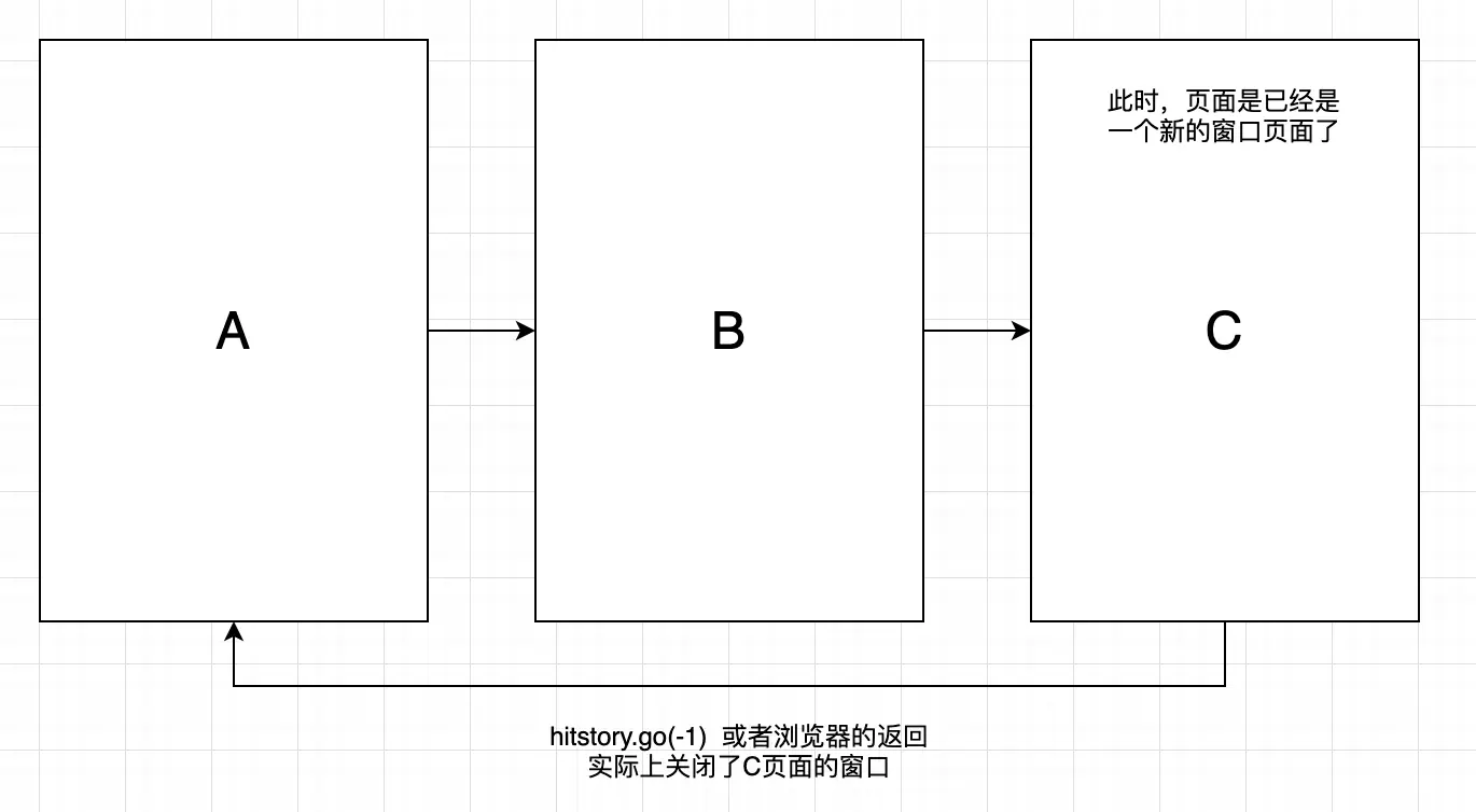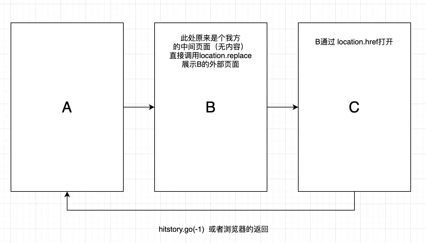 据外部开发老哥说,从B到C是调用location.href打开的,理论上按路由栈逻辑,调用go(-1),应该是到回他们的B页面,在PC端,点返回的确是会到了B页面,但是在 APP 上表现就到了 A 页面。