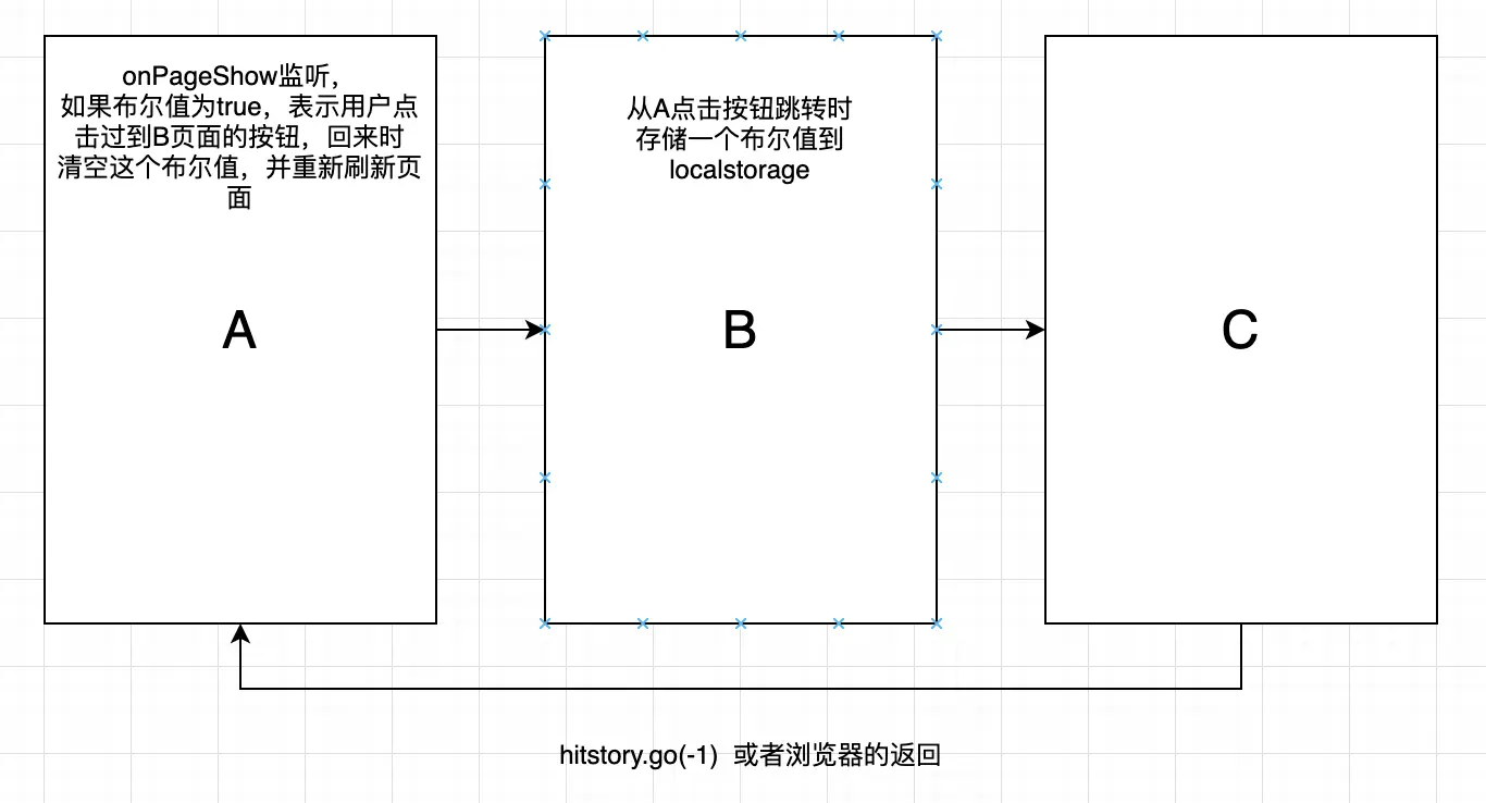 这个问题也是本次开发中遇到的最恶心的问题,为了解决这个问题,折腾到了凌晨4点。这个问题如下:从 我方 A 页面跳转到 B页面(外部),外部页面逻辑做完后,会重定向到我方的 C 页面,在C页面点返回,会返回到A页面,A页面接口偶现不刷新。即如图所示: