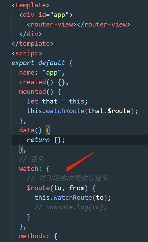 可以在这里进行路由监听,每次路径变化,做一些操作