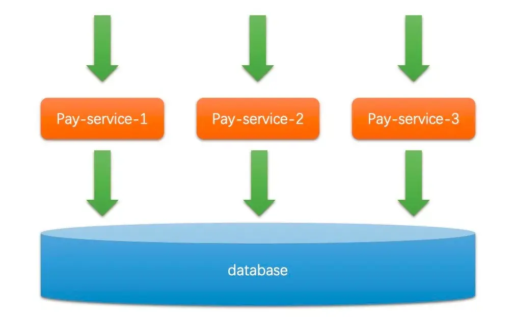也就是同一个应用启动了多个实例,连接着相同的数据库(为了简化问题,先不考虑数据库是否单点),如下图所示: