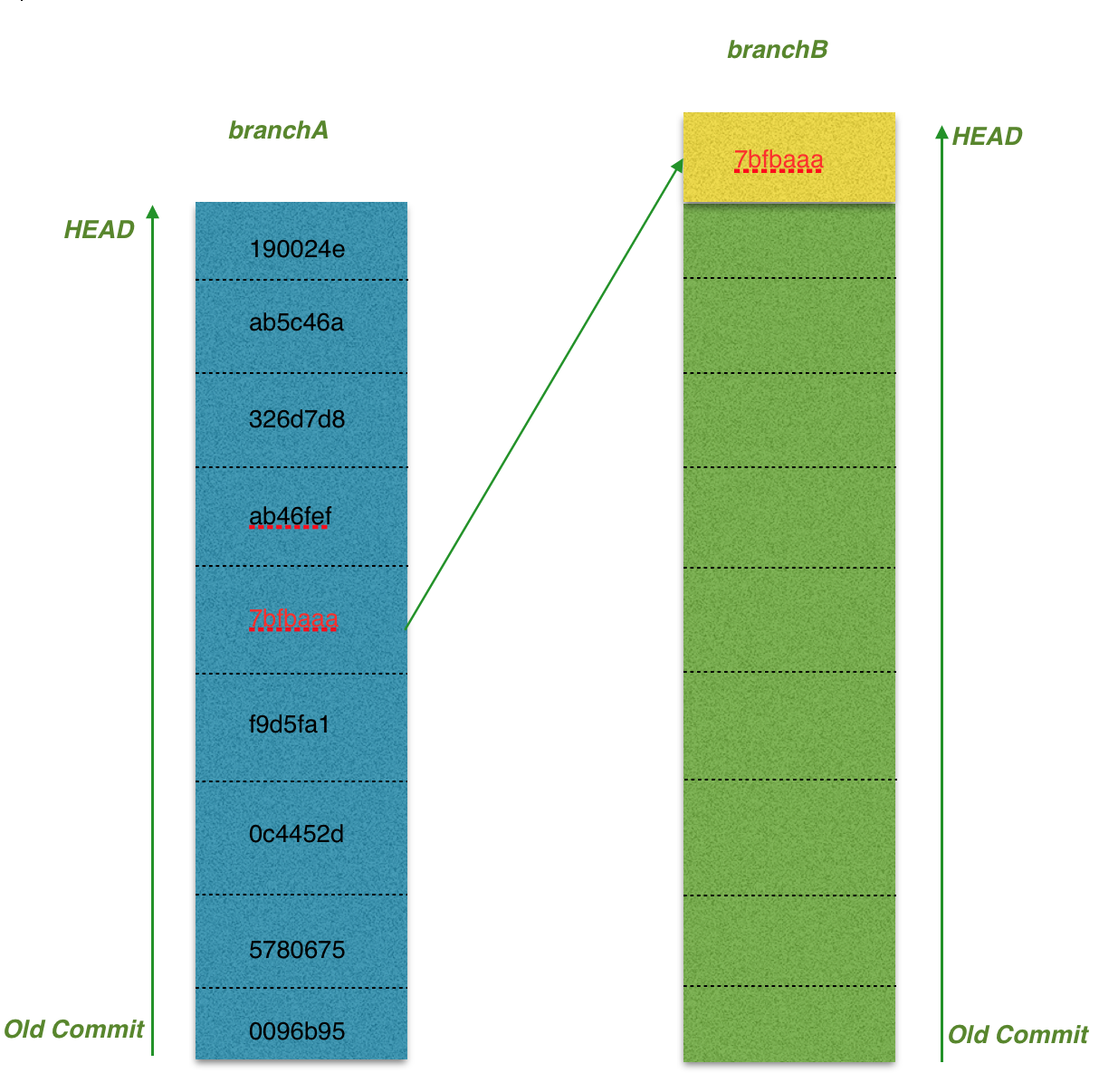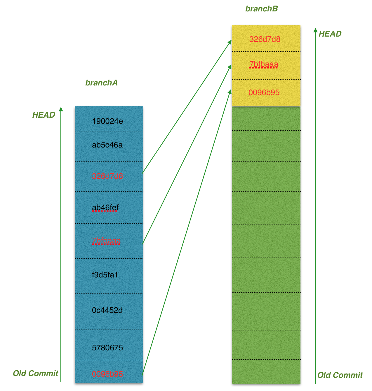 这样处理之后, 如果branchB分支需要branchA分支上的某个功能, 只需要找到这个功能的惟一的一个提交记录即可, 就不需要在很多commit之中寻找这个功能点的相关提交记录. 更改合并之后再移动功能点, 就简单了许多, 执行找到功能点的惟一一个提交记录, 让后使用git cherry-pick commit-hash即可, 操作示意图如下: