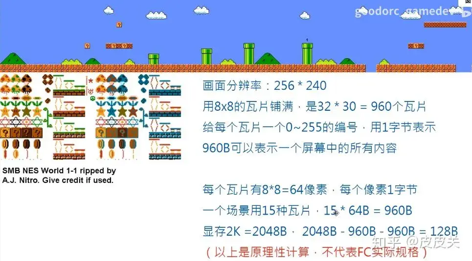 以红白机 FC 为例,它的分辨率为 256x240。分辨率不算低,但却只有 2KB 显存,而且还要实现全屏卷轴效果。