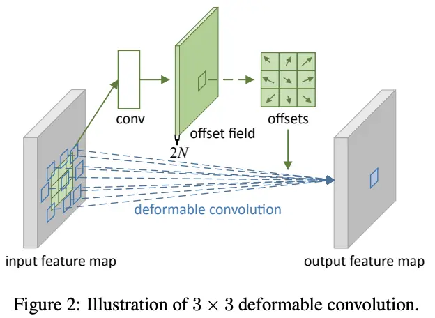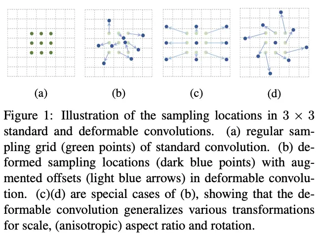 - deformable convolution,在常规的卷积中增加2D偏移值,可以将采样区域自由变形,如图1(d)。偏移值是可学习的,通过额外的卷积层获得,取决于输入的特征。