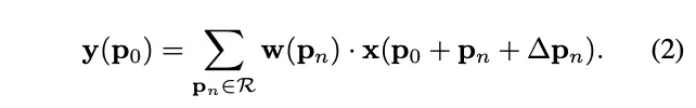 如图2所示,偏移特征图通过旁路的卷积层获得,为主干的卷积核大小,对输入特征进行变形卷积时取偏移特征图上对应点的偏移值向量组合成完整的offsets。训练时,同时学习两条路径,对于偏移值,通过公式3进行梯度的回传。