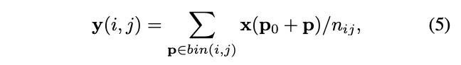 类似于公式2,可变形RoI pooling采用偏移值对bin进行整体移动,输出计算如公式6,由于