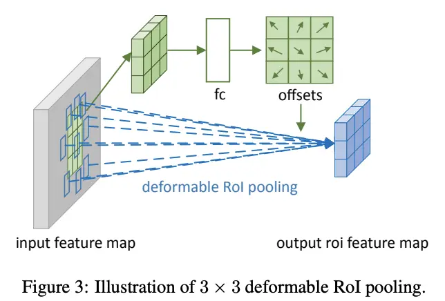 可变形RoI pooling的逻辑如图3,偏移值通过旁路卷积层获得,旁路的输入为RoI区域池化后的特征,接一个fc层输出归一化的偏移值,与RoI的尺寸无关,然后根据RoI区域大小转换为偏移值