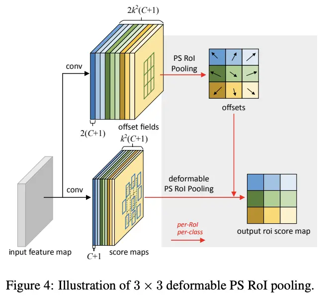 可变形PS RoI pooling遵循RFCN的全卷积理念,先用一个卷积层获得channel为的偏移特征图,单图大小与主干的score map一样,然后通过PS RoI pooling得到归一化的偏移值