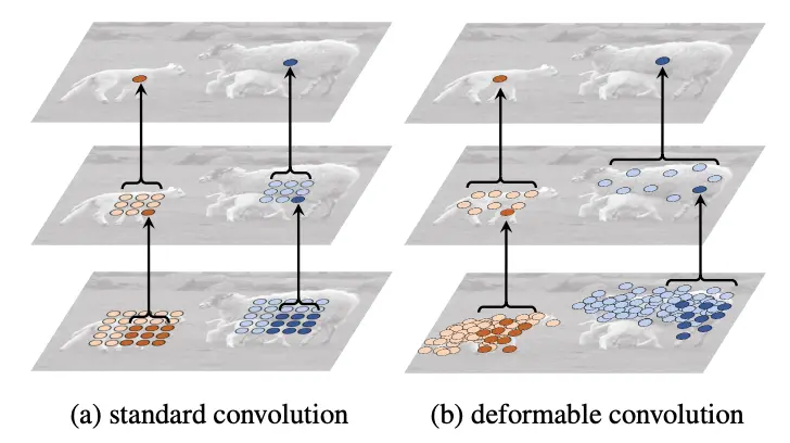 常规卷积操作的感受域是固定的,但不同大小的目标应该需要不同大小的感受域,甚至是不规则的感受域。为此,论文提出两个模块来使CNN具备几何变换的建模能力: