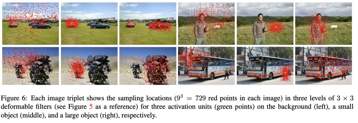 如图5所示,可变形卷积将原本固定的感受域根据目标自适应地调整,随着可变形卷积地叠加,高维像素点对应的感受域将会有很大的差异。