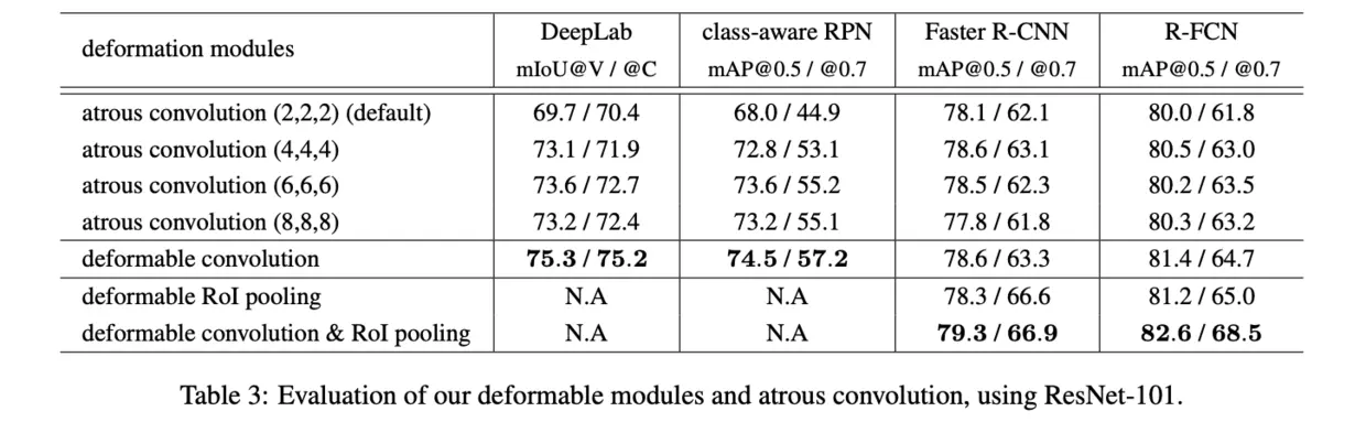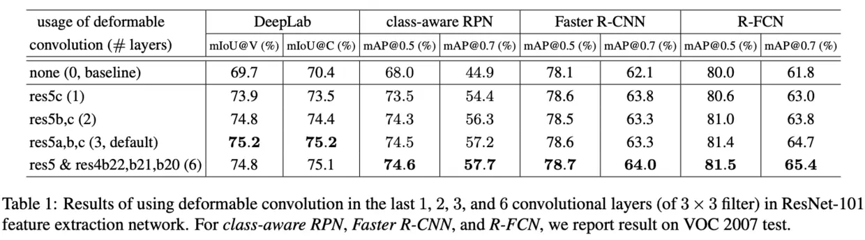 如表3,可变形RoI Pooling搭配可变形卷积能够达到最优的模型。