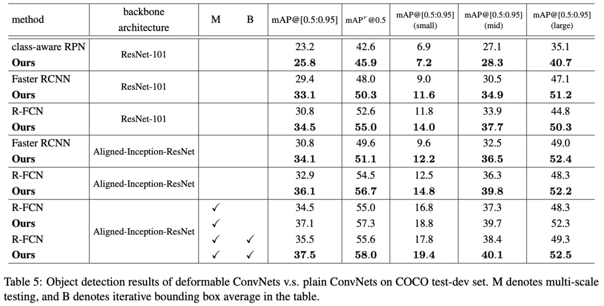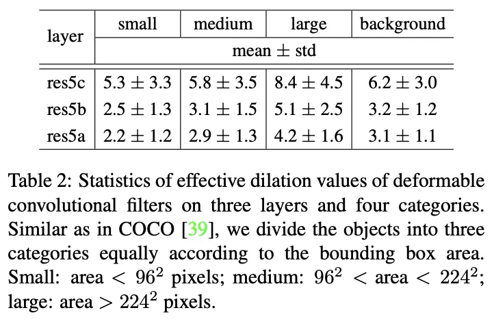 表1测试了在不同的位置加入可变形卷积的效果,不同的网络的效果不一致,整体都是可以提升的。而表2则是统计了不同大小物体的平均偏移值,偏移值跟物体大小相关,而背景的偏移介于中大物体之间,说明背景需要更大的感受域进行识别。表3与空洞卷积进行了对比,更大的膨胀值能有更好的性能,说明原来的感受域太小了,而不同的任务最优的膨胀值不太一样,说明可变形卷积是有存在意义的。