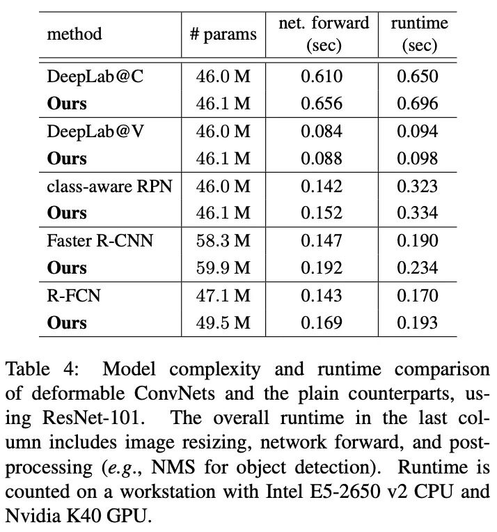 可变形卷积只增加了少量参数量和计算耗时,说明可变形卷积是通过提升模型的几何变化能力来提高性能,而不是堆参数。