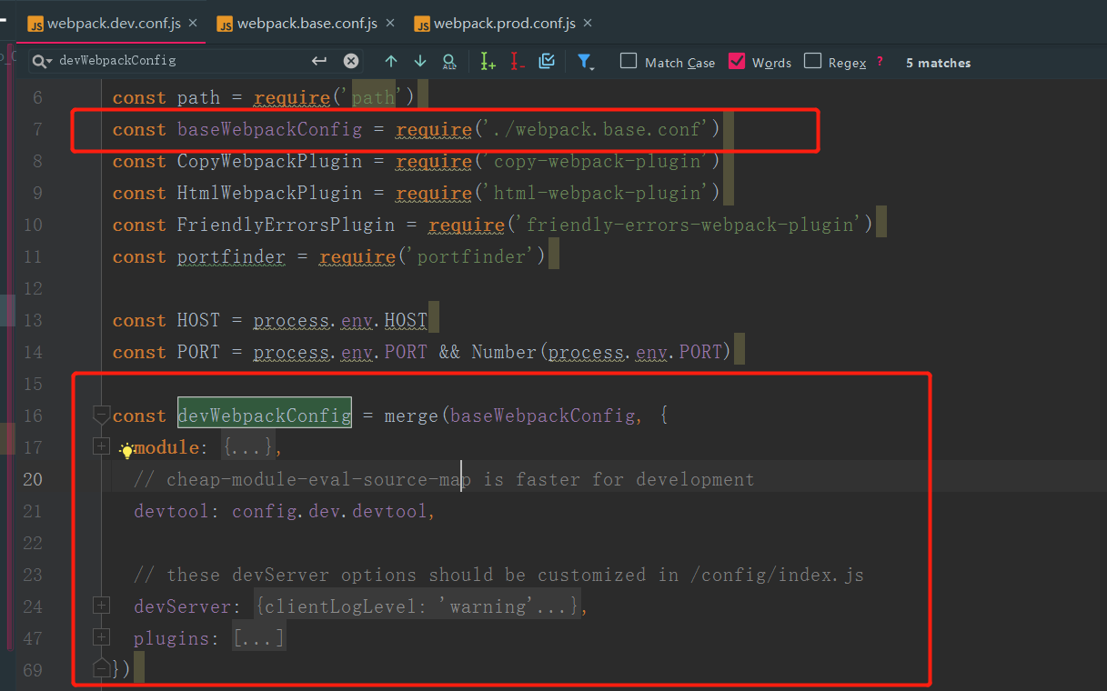4.build/webpack.dev.conf.js文件中require ./webpack.base.conf文件,并且合并入新的对象配置(可以参考webpack-marge)
