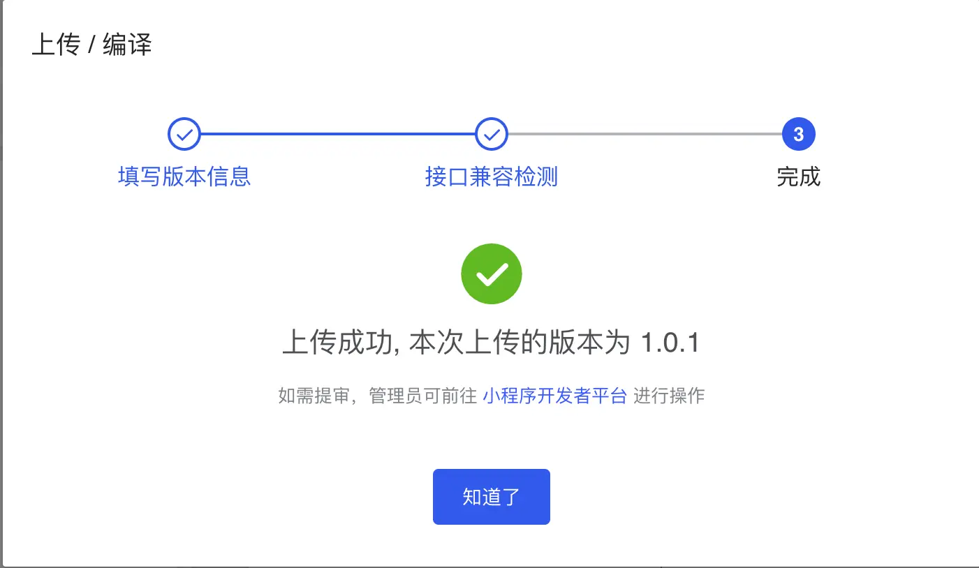 上传成功后,会提示进入小程序开发者平台,现在可以看到开发者的版本。