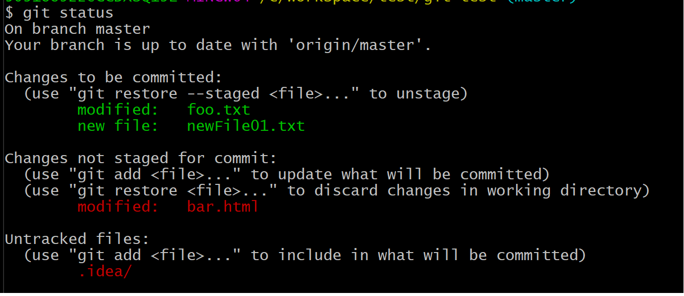 - Changes to be committed:这部分修改已经在暂存区中,将在下次commit中被纳入版本库中