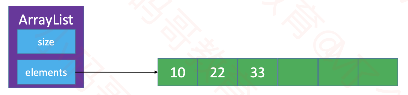 ArrayList是为动态数组取的名字,它内部有一个名为elements的数组,存放在动态数组的元素实际上是存放在这个数组里面的,size属性用于标记当前动态数组的元素个数。