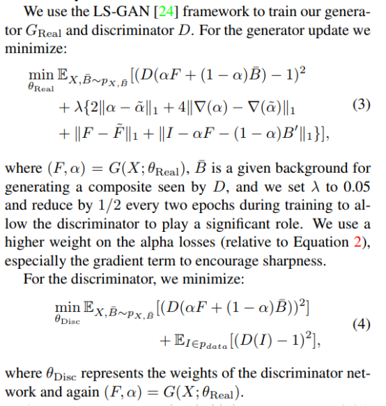 At the core of our approach is a deep matting network G that extracts foreground color and alpha for a given input frame, augmented with background, soft segmentation, and (optionally nearby video frames), and a discriminator network D that guides the training to generate realistic results.