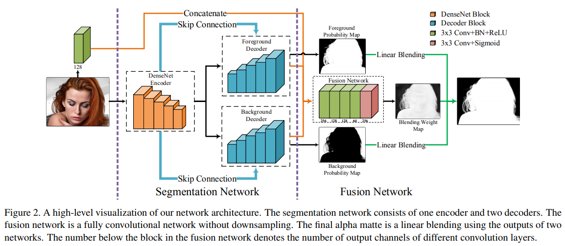 LFM是端到端的神经网络,输入包含前景的图像,输出为前景的alpha遮罩。利用神经网络来预测三个图:前景概率图、背景概率图和混合权重图。根据混合权重图将前景概率图和背景概率图进行融合得到alpha遮罩。需要训练的网络有分割网络预训练、融合网络预训练以及端到端的联合训练,训练损失加在输出alpha遮罩上。