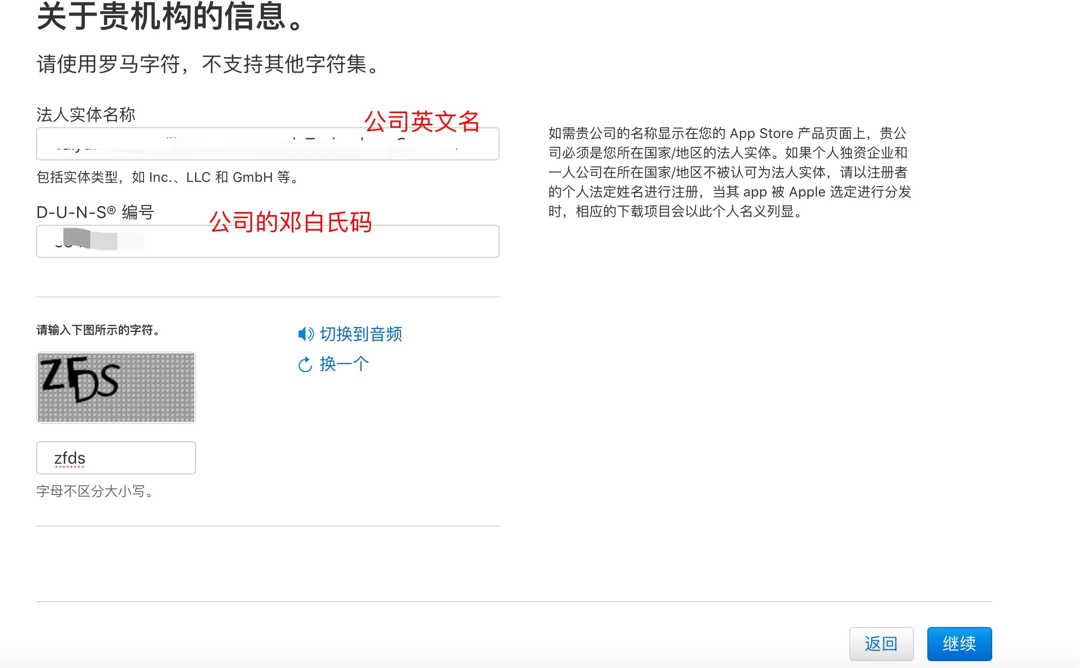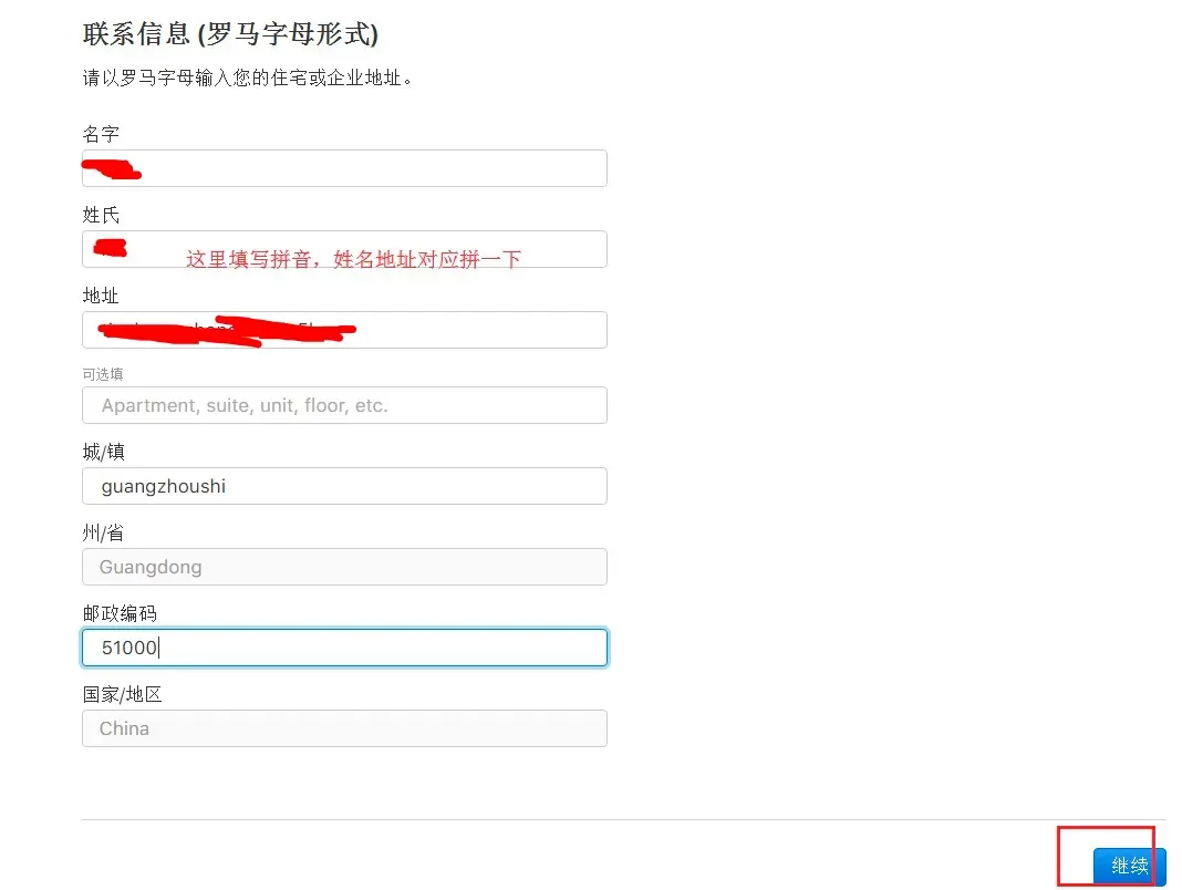 - 要认真填写,这个页面点击了"继续"之后,审查通过就不会出现了(未通过不知道会是什么情况),我是邮编部分填写错了,后来电话和相关的技术支持进行的沟通。