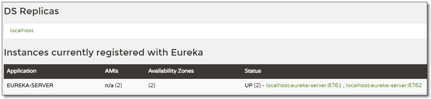 访问:http://localhost:8761/ 或者 http://localhost:8762/ 都出现如下图说明互相注册成功。