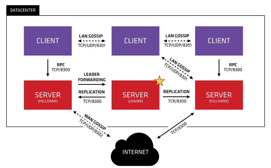 每个数据中心,Client 和 Server 是混合的。一般建议有 3~5 台 Server。这是基于有故障情况下的可用性和性能之间的权衡结果,因为越多的机器加入达成共识越慢,Server 之间会选举出一个 Leader。然而并不限制 Client 的数量,一般建议一个服务对应一个 Client,它们可以很容易的扩展到数千或者数万台 。在开发时我们绑定一组服务注册中心中的客户端即可。