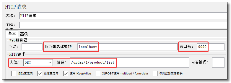 HTTP 请求配置为服务消费者的 http://localhost:9090/order/1/product/list