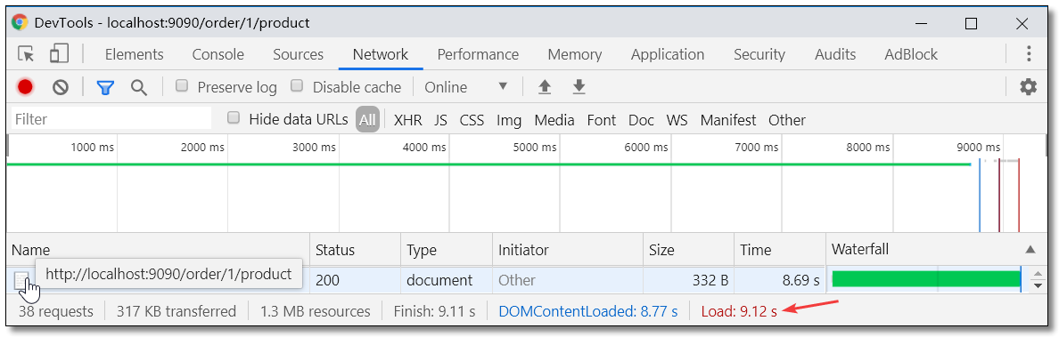 通过 JMeter 开启 50 线程循环 50 次请求服务消费者 http://localhost:9090/order/1/product/list 然后浏览器再次请求 http://localhost:9090/order/1/product 统计耗时如下。请求耗时:9.12s