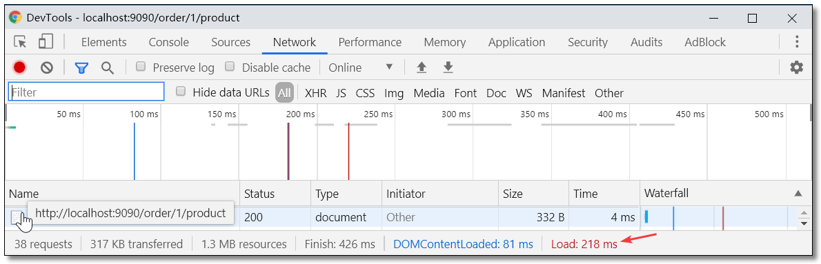 浏览器请求 http://localhost:9090/order/1/product 统计耗时如下。请求耗时:235ms