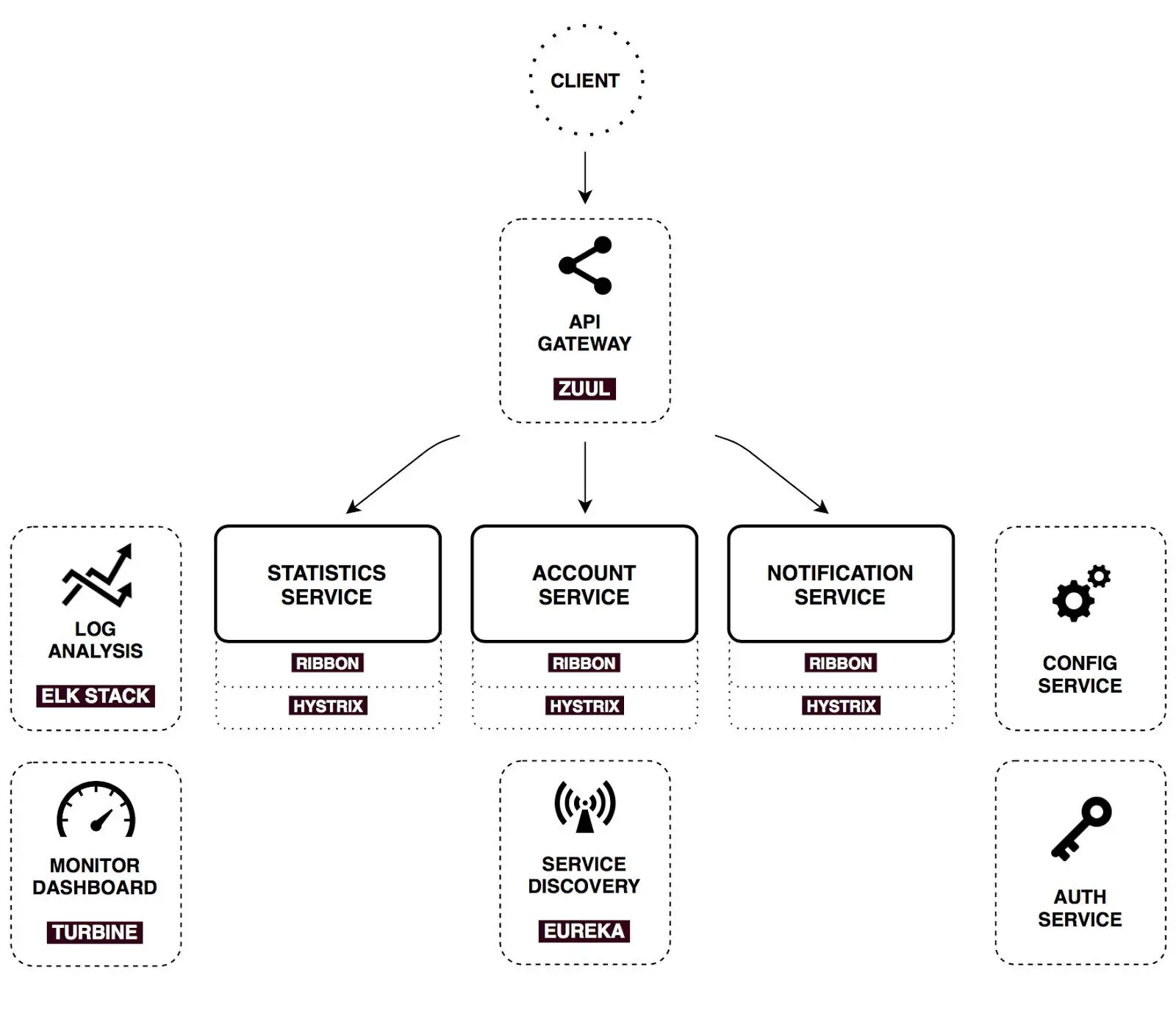 使用 Zuul 的 Spring Cloud 微服务结构图: