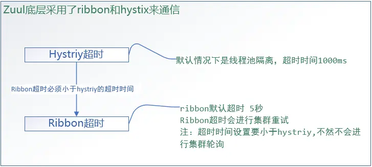 Zuul 中的 Hystrix 内部使用线程池隔离机制提供请求路由实现,其默认的超时时长为 1000 毫秒。Ribbon 底层默认超时时长为 5000 毫秒。如果 Hystrix 超时,直接返回超时异常。如果 Ribbon 超时,同时 Hystrix 未超时,Ribbon 会自动进行服务集群轮询重试,直到 Hystrix 超时为止。如果 Hystrix 超时时长小于 Ribbon 超时时长,Ribbon 不会进行服务集群轮询重试。