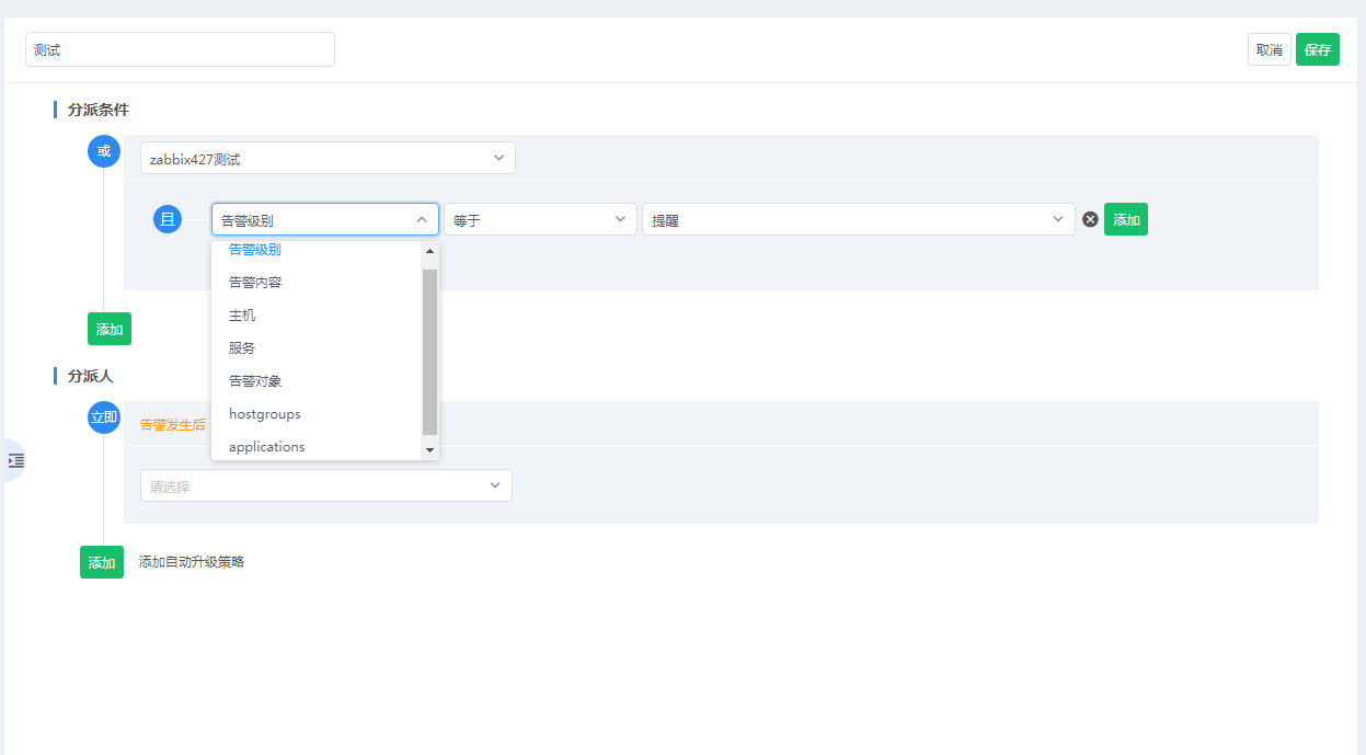分派策略:设置的是告警发生时所通知的人;用户可以在分派策略中设置筛选条件,使得告警更加的灵活分派;也可以设置分派给组或者是钉钉等群成员的通知。